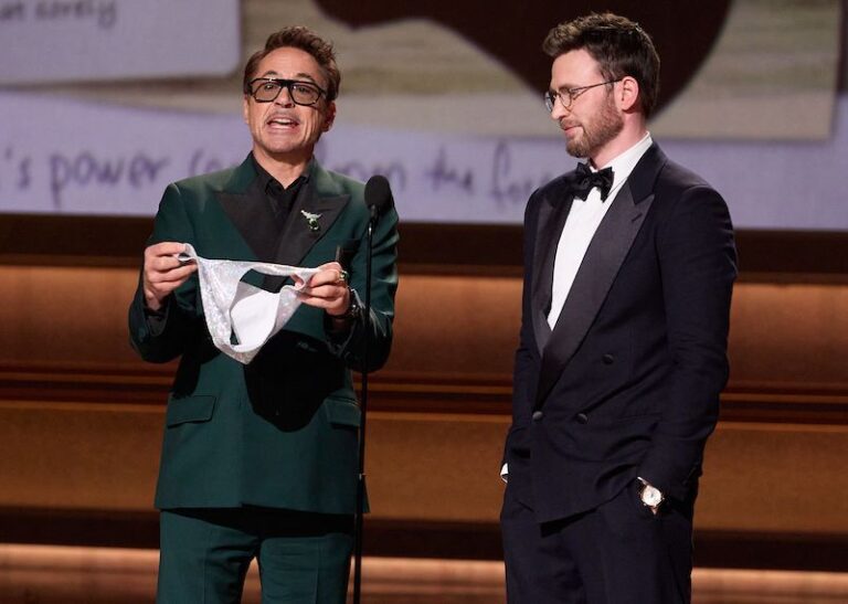 O humornou vsuvku se postarali také herci Robert Downey Jr. a Chris Evans, když spolu uváděli scenáristické kategorie. Evans si z Downeyho dělal legraci, že mu k výročí prvních Avengers nepřinesl žádný dárek. Downey nejdřív předstíral, že nic nemá, jenže pak se triumfálně vrátil na pódium a z kapsy vytáhl blyštivá tanga, která označil za „oficiální tanga Channinga Tatuma z filmu Magic Mike“. Evans byl lehce v šoku, ale publikum vybuchlo smíchy a z hlediště se ještě ozval i samotný Tatum, který na celou scénku reagoval slovy, že je bude potřebovat zpátky.