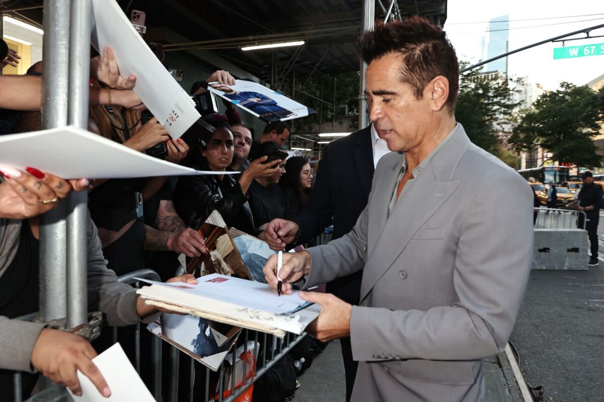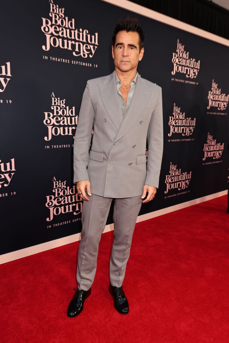 Nechyběml ani Colin Farrell, který měl na sobě břidlicově šedý dvouřadý oblek a k němu odpovídající košili, rozepnutou tak, aby odhalovala malý zlatý řetízek. Vzhled doplnil černými lakovanými společenskými botami.