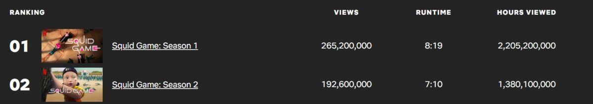 Hit, který zasáhl naše srdce v roce 2021, rychle překonal rekord v počtu zhlédnutých hodin na Netflixu za jeden týden mezi neanglicky mluvícími tituly. Od 27. září do 3. října 2021 tehdy první řada zaznamenala 571,76 milionů zhlédnutých hodin (k dnešnímu dni má 2 205 200 000 zhlédnutých hodin).