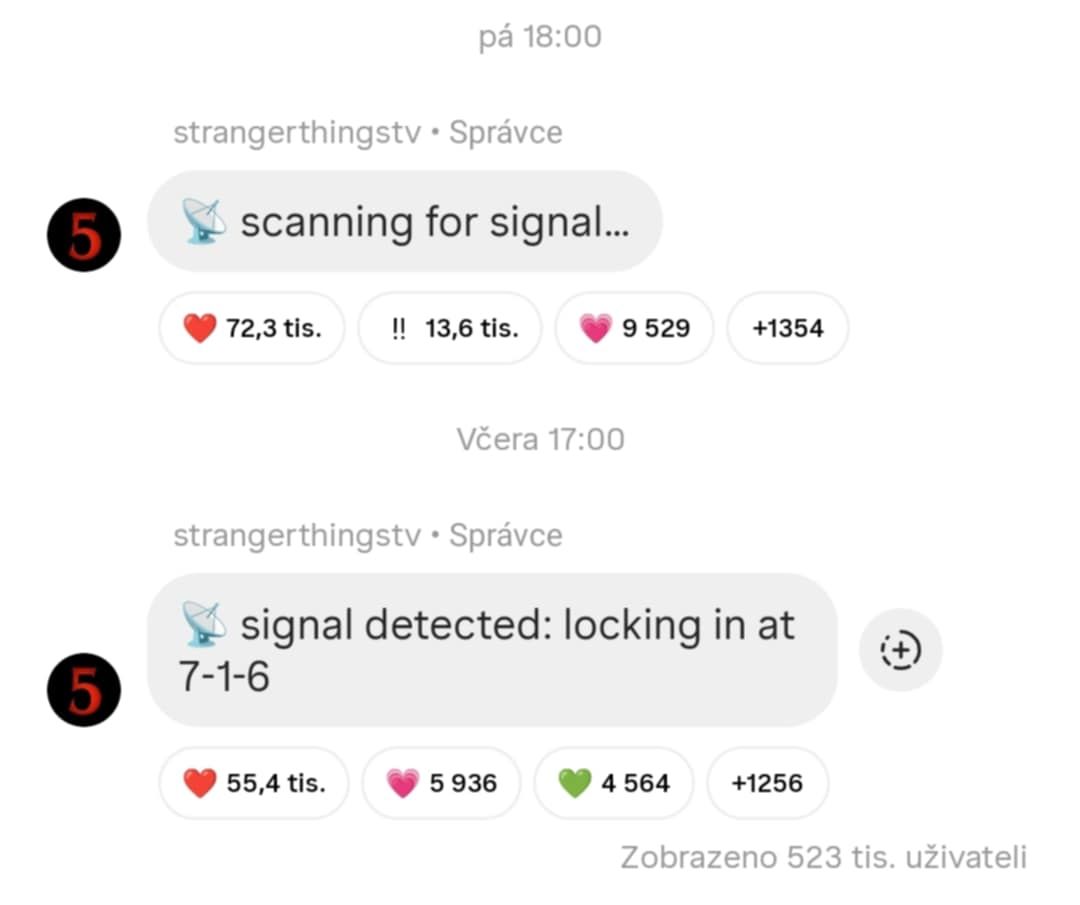 Zvěsti ještě více podnítily zprávy na instagramovém kanálu na profilu Stranger Things, které se objevily v posledních dnech. Zatímco v pátek přišla zpráva: „Hledá se signál…“, v pondělí večer přišlo upozornění na další. V té stálo: „Signál detekován: Zaměřování na 7-1-6.“ Zprávy vyvolaly podezření, že se Netflix chystá učinit zásadní oznámení ohledně poslední řady.